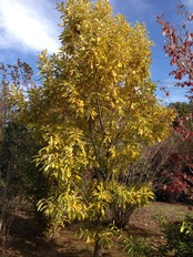 春の新葉は美しい黄色で展開し、同時にひも状の花序が伸びて黄色の花が開くので見事です。黄色で展開した葉は、梅雨入り前までに黄緑色に変わります。